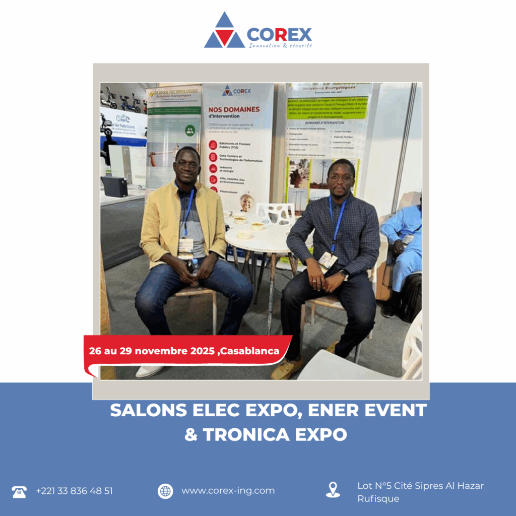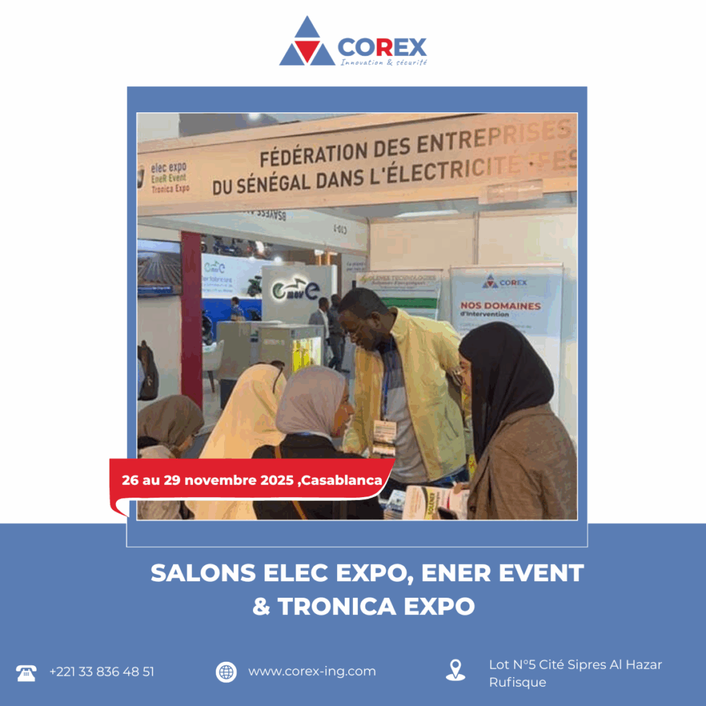 Du 26 au 29 novembre 2025, Groupe COREX participe aux Salons Elec Expo, Ener Event & Tronica Expo à Casablanca au stand réservé pour le Sénégal.